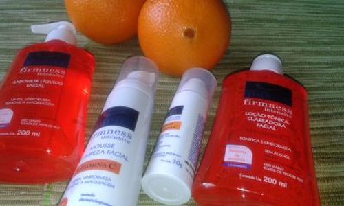 A linha Firmness Intensive com Vitamina C, da Nupill,  inclui: Tônico Facial Clareador, Loção de Limpeza, Mousse de Limpeza e Creme Firmador.