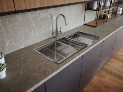 Dimensão e design pensados para ampliar a funcionalidade da bancada no modelo Deca Wish, que inclui em uma única peça duas cubas e uma calha organizadora central com nichos de escoamento para talheres, pratos e copos.