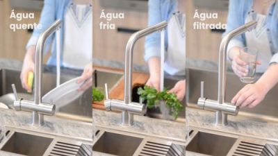 Dois manípulos – um para acionamento da água quente e fria e outro, independente, para a água filtrada – evitam a mistura de funções.  As paredes internas do misturador são livres de porosidades, o que impede o acúmulo de partículas. O uso é facilitado pelo corpo com rotação de 360º e bica com giro lateral para aumentar o alcance do jato. O arejador, que faz a mistura da água com o ar reduzindo o consumo, e o sistema anti gotejamento representam uma boa economia na conta da água. Outro diferencial é o mecanismo de vedação com discos cerâmicos, que garante uma elevada durabilidade e proporciona maior precisão na mistura da água quente e fria.