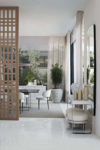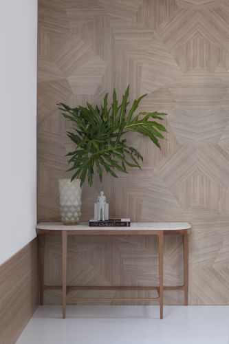 A vitrine, assinada por Ana Letícia Virmond, se estende por 97m² e é ocupada por um amplo living e uma aconchegante sala de jantar. Nada é supérfluo ou demais no ambiente. Cada detalhe foi pensado para valorizar a simplicidade e o conforto. Passa longe, contudo, do conceito minimalista uma vez que texturas, linho, pele, camurça, o revestimento de madeira e cores neutras, como off white e caramelo, se encarregam de espalhar a sensação de aconchego pelo espaço.