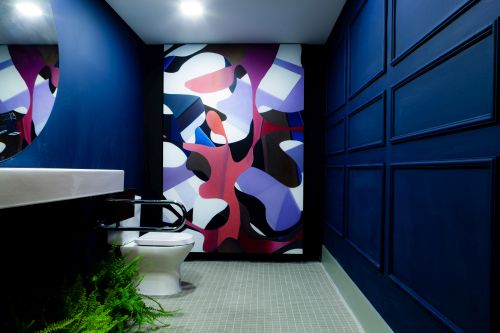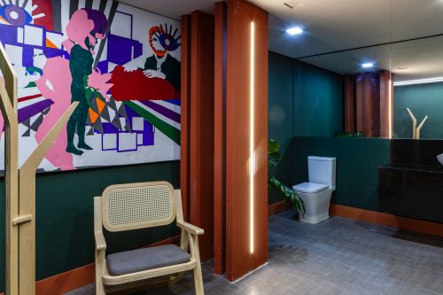 A decoradora Simone Schulmeister assinou dois ambientes unissex, um banheiro funcional e o outro adaptado. Neles, a arte urbana ocupa um espaço privilegiado contrastando com as cores fortes das paredes. A interação é um dos motes do projetos: recadinhos, poesias, desenhos e mensagens têm um local específico para serem divulgados, como acontece em banheiros de bares ou baladas.