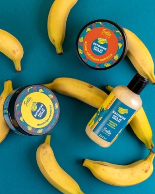 -Manteiga nutritiva corporal é enriquecida com ácido hialurônico, manteiga de karitê, pantenol e extrato de banana. Promove hidratação intensa, nutrição e proteção contra o ressecamento. Sua coloração e textura lembram a fruta in natura, observada no início da cadeia produtiva das balas de banana.