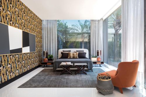 Os arquitetos Sérgio Valliatti e Luciana Patrão projetaram um ambiente contemporâneo composto por living com apoio para bar, office e quarto. Nele, destaca-se a mescla de tons monocromáticos de preto contrastando com verdes e terrosos. Almofadas desenhadas pela bicentenária marca de tecidos Sahco dão sofisticação ao sofá que une o living à mesa-bar. Todo o espaço foi pensado para captar os sentidos de uma forma bastante sutil, por isso, resultou em um conjunto que transmite equilíbrio e casualidade. A tela Diptilo, de Carlos Muniz, e as fotos de Cahique Lahgiz, série Costa Esmeralda, se encaixam harmoniosamente com a proposta dos arquitetos.