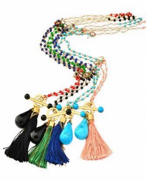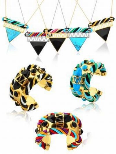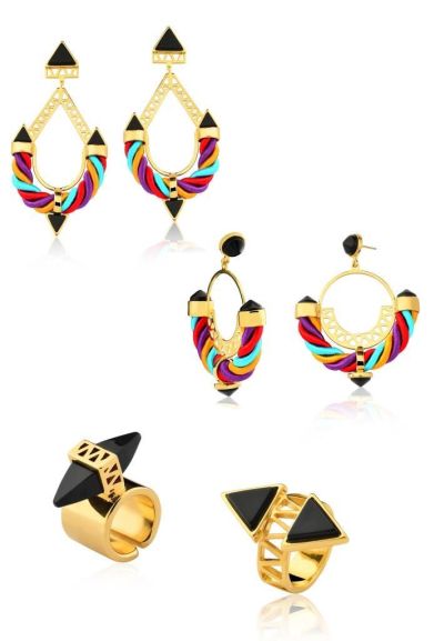 As pedras, lapidadas em formatos triangulares, aparecem em cores como o turquesa, marinho e preto. Elas vêm em maxi colares, que nos remetem às pirâmides dos antigos maias. Aparecem ainda em brincos pendurados, de argolas, junto com metais filigranados. Os anéis de aro de metal ganham pedras lapidadas também de forma redonda e quadrada. As cordas retorcidas surgem como base de colares, brincos e debruam braceletes de metal, ornados com pedras redondas. Entre os elementos utilizados, além das pedras brasileiras, em especial o ônix, estão os metais folheados, em dourado predominantemente e fios de seda coloridos. Verde e azul, em suas diversas nuances, além do pink, amarelo e lilás são as tonalidades que se destacam.