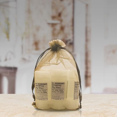 O álcool tem aloe vera, garantindo a hidratação das mãos – um diferencial no produto já que o excesso do seu uso pode ressecar a pele. O kit vem em uma bonita embalagem de organza, disponível em várias cores.