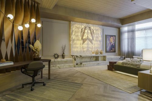 Uma sugestão bem-vinda dada pela Viviane Busch foi separar no ambiente uma área para meditação e energização. Um cristal de 1,5m e 250kg, que veio especialmente de Ametista do Sul, destina-se a estabilizar a energia no espaço. Na área de meditação, a Reveev propôs um futon da Reveev em couro, que compõe com a cabeceira da cama. No restante do mobiliário, destaques para as peças da Natuzzi e Jader Almeida, e as obras de Juarez Machado e Veralu.