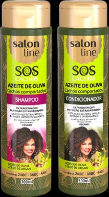 O shampoo e o condicionador da linha Azeite de Oliva Cachos Comportados, da Salon Line, contêm ingredientes que auxiliam na restauração da fibra capilar. O  óleo de Argan, também presente na sua fórmula, tem a função de nutrir e hidratar os fios.  O shampoo garante uma limpeza nutritiva proporcionando um brilho intenso. Já o condicionador é o responsável por desembaraçar e selar as cutículas. Todos os produtos são veganos e possuem proteção UV.