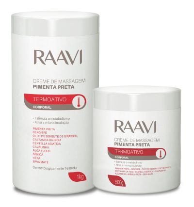 O Creme de Massagem de Pimenta Preta, ingrediente indicado para a redução de medidas e celulite, passou por reformulação assim como toda linha Termoativo da Raavi Dermocosméticos, da qual faz parte. O produto tem agora uma maior concentração de ativos que combinados potencializam seus efeitos e aumentam a durabilidade do aquecimento. Além da pimenta preta na sua fórmula estão outros ativos termogênicos como gengibre e um blend de extratos vegetais (arnica, castanha-da-Índia, centella asiática, cavalinha, alga fucus, hera, erva-mate) que estimula o metabolismo, a circulação e o sistema linfático.