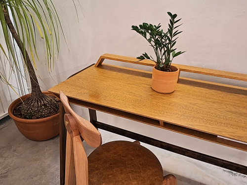 Escrivaninha que Daniel Ferrarezi criou especialmente para Juliana, sua esposa. Com o isolamento e a recomendação de permanecer em casa, durante a pandemia, ele pensou em desenhar um móvel que tornasse a rotina de trabalho dela mais leve e agradável. Puro afeto.