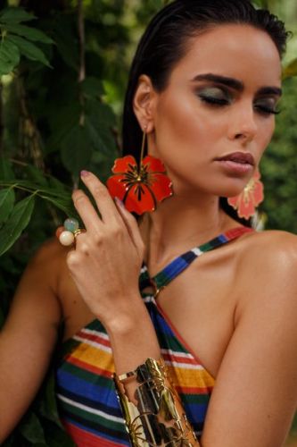 Do co-branding para a produção da coleção resultou uma interessante série de tiaras, anéis, brincos, braceletes, pingentes na qual não faltaram maxi peças tão ao gosto de Dudu Bertholini. Trinta modelos diferentes remetem a folhas e flores capturadas de nossas florestas, quintais e jardins como costela de Adão, strelitzias, hibiscos e bananeiras, além da linhaGeo, que apresenta formas geométricas irregulares.