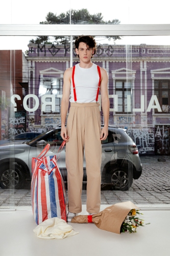 Nada mais sincronizado com a sensibilidade millennial do que intervir em uma roupa pronta e lhe dar uma nova utilização – bermudas masculinas viram micro shorts femininos, calças se transformam em shorts, pulôvers e camisas são compartilhados pelo casal – para ela, as peças podem ser complementadas por um lenço com estampa exclusiva.