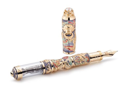 A caneta-tinteiro evoca uma visão dramática da Grande Muralha girando como um enorme dragão de pedra sobre uma vasta paisagem. Inspirada na tradicional arte da dinastia Ming, a metáfora do dragão ganha vida na tampa e corpo de ouro amarelo maciço Au750 cravejado com um pavé de safiras, rubis, turmalina e diamantes, que variam em cores de amarelo e vermelho a tons de azul e turquesa. Uma caixa de música em miniatura feita  à mão, que toca música inspirada pelo som de sinos, foi inserida no cone do instrumento de escrita e decorada com um pavé de safiras azuis. Ela faz referência a um tradicional instrumento real usado em rituais chineses. Um diamante de corte brilhante de 4,69ct coroa a edição no topo da tampa de ouro maciço Au 750 esqueletizado e gravado à mão simbolizando as garras de um dragão segurando a pedra preciosa. Um leão guardião chinês, símbolo tradicional de proteção tão poderoso quanto a própria Grande Muralha, é representado em uma imagem 3D gravada à mão no clipe móvel também de ouro amarelo maciço Au 750.