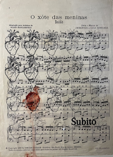 “Pinturas para Ouvir” nomeia a exposição de Adriane Pasa, em cartaz na Galeria do Multiespaço São Francisco 179. Uma abordagem inusitada caracteriza o trabalho da artista visual que transforma partituras antigas, geralmente encontradas em sebos da cidade, e folhas de pauta em branco em suportes e bases para uma série de 25 obras, produzidas neste ano. Elas revelam um universo de desenhos, monotipias, impressões digitais, objetos e técnicas mistas, que entrelaçam carimbos, colagens e ícones do cotidiano, além de resultados de eletrocardiograma (de seu próprio coração), rasgos e tecidos, que criam camadas de significado e texturas que convidam o espectador a uma experiência sensível e intimista.
