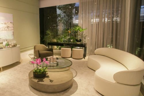 As formas arredondadas do  buffet Constantini e os contornos alongados e o encosto em formato de concha do sofá Carrie contribuem para dar contemporaneidade e minimalismo ao ambiente.