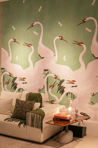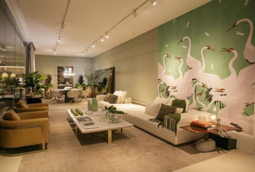 Os pássaros do papel de parede Gucci, trazido com exclusividade para o ambiente, foi um dos itens inspiradores do  living. O verde do seu fundo motivou a exuberante vegetação integrada ao espaço através de vasos Organne.