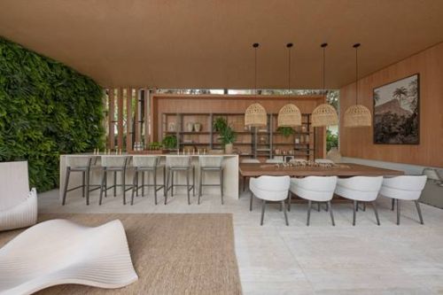 As peças-chaves do espaço são mesa/coluna de jantar OAK e a poltrona Banyan II assinadas pelo Estúdio Artefacto, além de móveis como  a poltrona Vic do Piegatto e a estante Jeri assinada por Roberto Cimino e Nelson Amorim. Todas da linha Beach & Country da Artefacto.