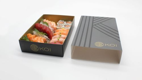 Os apreciadores de uma culinária com toque gourmet, certamente, vão apreciar ainda mais uma das delícias da cozinha japonesa: o delicado sushi. A proposta é da Koi Premium, de Londrina, que lançou uma embalagem particularmente especial para servir esta opção do menu oriental: uma caixa deslizante com interior dourado. Um porta-joias para ser entregue no restaurante ou na casa do cliente.