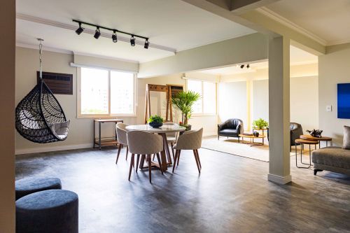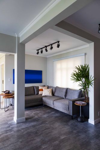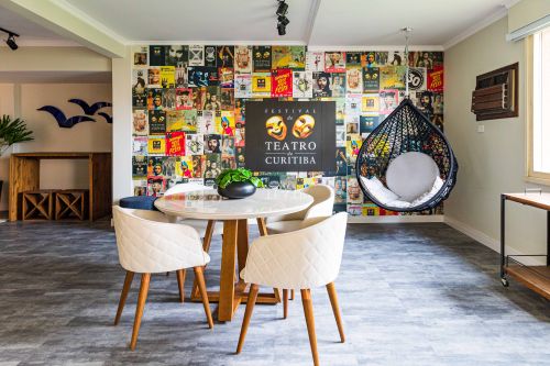 A designer de interiores Jordana de Fraga assinou a transformação de uma suíte do hotel em um living com ambientação tematizada no trigésimo aniversário do Festival do Teatro. Um ousado projeto que com a proposta de ampliar o espaço e promover uma maior integração não hesitou em realizar algumas mudanças estruturais. Paredes foram removidas, o banheiro perdeu área, a iluminação foi redirecionada e o carpete retirado para dar lugar a um piso mais prático e seguro.
