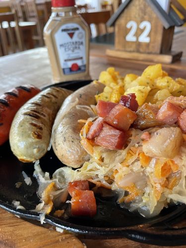 Nos pratos principais, o Eisbein, ou joelho de porco, vem em duas opções: assado à pururuca ou defumado. O prato pode vir bem guarnecido com kassler (bisteca suína defumada), salsichas alemãs, purê de batata rústico com bacon, purê de maçã e repolho roxo com uvas passas, ou com menos acompanhamentos, ao gosto do cliente. O Reibekuchen aus Kartoffeln (panquecas de batata com salmão curado com purê de maçã), o Schnitzel (corte fino e suculento de carne suína empanado ao molho de champignons e batata sauté), o Marreco (coxa e sobrecoxa de marreco cozidas lentamente, purê de maçã e repolho roxo com uva passas) e o Spätzle com Champignons (massa tradicional alemã feita com ovo caipira, servida com molho de champignons frescos) complementam a seleção gastronômica da casa.