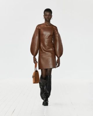 Silhuetas com inspiração renascentista, tecidos e materiais inovadores refletem o poder feminino das pinturas de Artemisia. Um casaco puffer com franzido nas costuras é feito de náilon reciclado e um vestido ombro a ombro acima do joelho é cortado em couro Napa – uma abordagem gráfica e modernista do Renascimento. O uso de tecidos contrastantes em preto e branco acentua a cintura em forma de coração e decotes altos de vestidos, imprimindo essas referências históricas com uma estética contemporânea. Gaze de lã de baixo impacto – um tecido pilar da Chloé – oferece uma declaração sutil de poder feminino e é usado em uma variedade de peças, incluindo capas e vestidos longos.