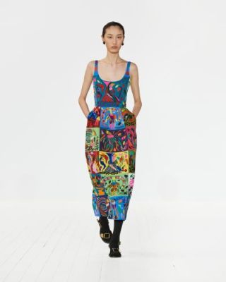 A obra “Esther before Ahasuerus”, inspirada na personagem bíblica Ester, é transposta em vestidos e bolsas como uma tapeçaria gráfica e multicolorida – trabalho de Chanakya, do Mumbai Atelier internacional de bordados, que, por meio de sua escola de artesanato, proporciona às mulheres de comunidades de baixa renda uma educação de qualidade.