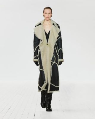 Silhuetas com inspiração renascentista, tecidos e materiais inovadores refletem o poder feminino das pinturas de Artemisia. Um casaco puffer com franzido nas costuras é feito de náilon reciclado e um vestido ombro a ombro acima do joelho é cortado em couro Napa – uma abordagem gráfica e modernista do Renascimento. O uso de tecidos contrastantes em preto e branco acentua a cintura em forma de coração e decotes altos de vestidos, imprimindo essas referências históricas com uma estética contemporânea. Gaze de lã de baixo impacto – um tecido pilar da Chloé – oferece uma declaração sutil de poder feminino e é usado em uma variedade de peças, incluindo capas e vestidos longos.