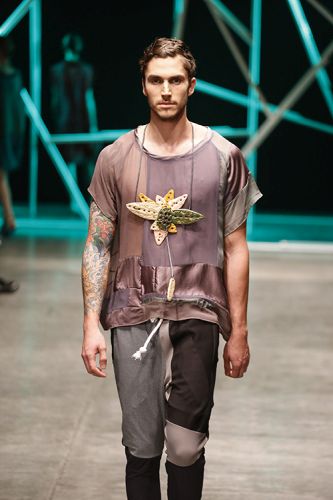 Desfile da H-AL, moda autoral de Alexandre Linhares e Thifany F. , traz acessório assinado por Marcel Fernandes.