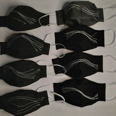 Máscaras confeccionadas em tecido tricoline 100% algodão com tripla camada. Dupla face – podem ser usadas do lado claro ou do lado escuro. Laços para amarração na cabeça e no pescoço. Elástico roliço anatômico duplo com tingimento tie dye.