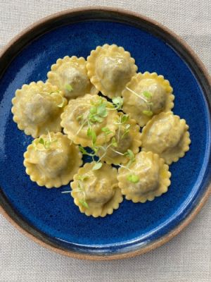 Ravioli recheado com mignon e cebola caramelizada. Foto: Angélica Fenley Belich