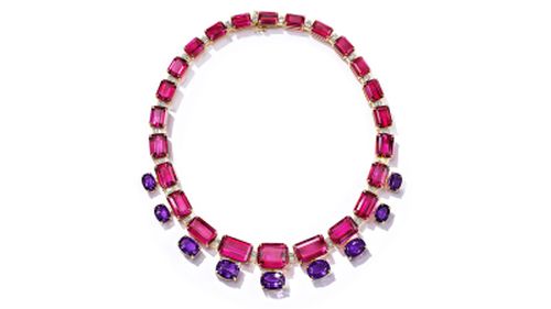 Colar em ouro amarelo 18k com rubélites, ametistas e diamantes.