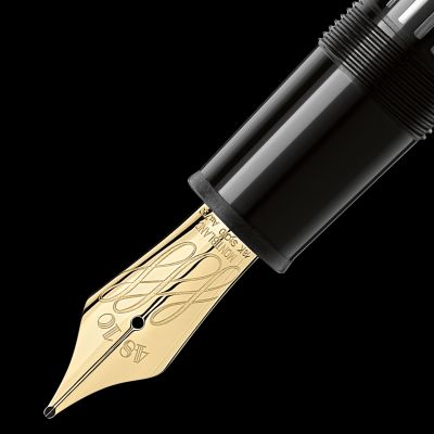 -Fabricada em resina preta preciosa com acabamentos revestidos de ouro, a icônica Meisterstück 146 apresenta agora a pena flexível desenvolvida com base nas canetas Montblanc de muito sucesso da década de 1950. Feita em ouro amarelo 18k permite, conforme se exerça diferentes pressões no papel, uma variedade de largura de linhas produzindo diferentes tons de cor no papel. A pena tem gravado o símbolo de caligrafia “888″.