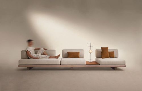 PEÇA INSPIRAÇÃO: referência nos tradicionais tamancos japoneses, cuja característica principal são as suas bases em madeira flutuantes. A expertise dos japoneses também pode ser vista nos precisos encaixes da madeira combinado com um estofado de traços limpos e extremamente confortável. Os estofados e mesas de apoio foram projetados em módulos independentes, possibilitando inúmeras opções de uso e montagem.