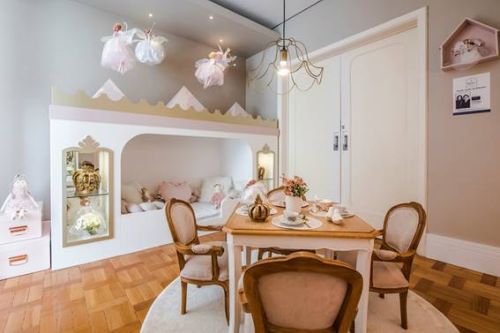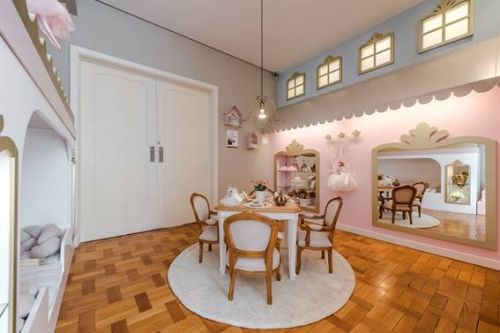 Estilo romântico, tons suaves e detalhes aplicados em dourado. O ambiente não apenas lembra os contos de fada como tem uma princesa de verdade como inspiradora: Charlotte, filha do casal da realeza britânica, William e Kate. A cama em formato de castelo é cercada por cones que imitam torres. A mesa central recebeu poltronas Luis XV e tons de rosa, dourado e fendi foram escolhidos para trazer sofisticação e delicadeza ao quarto. No projeto luminotécnico, destaque para o lustre. A pintura da parede tem a assinatura da artista plástica Glória Regina Bertolo. O espaço foi projetado pelas designers de interiores Ana Paula Gusso e Marina Rinaldi.