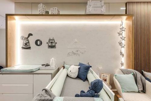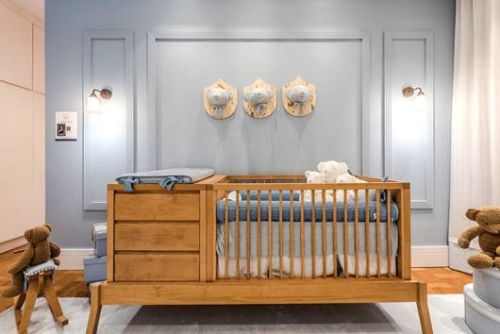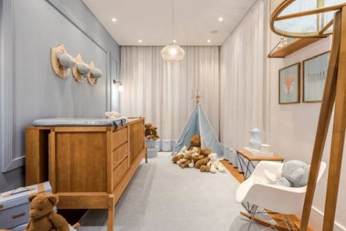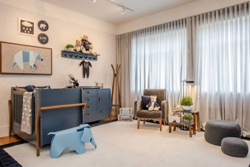 Contemporâneo, funcional e atemporal, o Quarto do Thomaz, projetado por Mariana Stockler, em homenagem ao bebê da consultora de estilo Thayane Goes Milani, mescla elementos modernos com detalhes clássicos. Com um berço multifuncional de design moderno, que acompanha o desenvolvimento da criança ao se transformar em cama e escrivaninha, a arquiteta optou por trabalhar com boiseries na parede do fundo do berço e arandelas laterais para trazer leveza e sofisticação ao ambiente. Tapetes, cabana, quadros e ursinhos compõem a decoração do espaço que tem mobiliário de madeira e tons de azul claro.