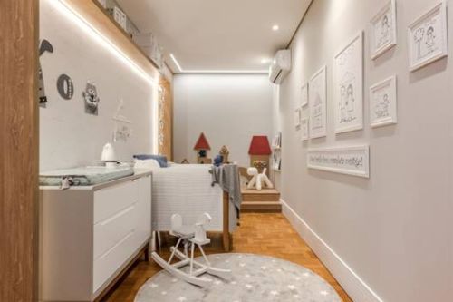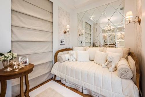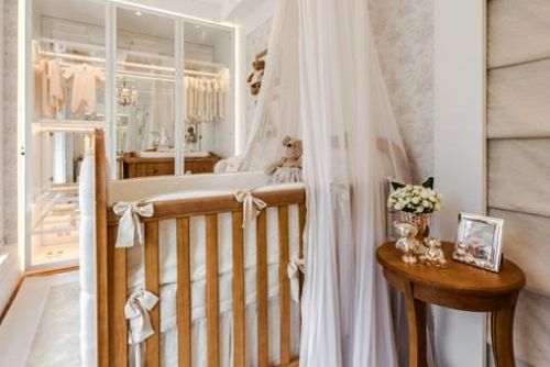O objetivo do arquiteto Antonio Taques foi criar um ambiente funcional e que acompanhasse as várias etapas do crescimento da criança. Madeira natural, laca, espelhos e vidros trazem um toque clássico e atemporal ao espaço. A mesma proposta seguida na escolha dos tons: brancos, beges e crus, que aparecem em vários pontos do quarto. Um dos destaques do projeto é a parede revestida de espelhos prismáticos que fazem referência ao trabalho de matelassê. A homenageada é a grávida Maria Victória Barros.