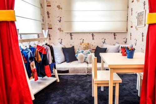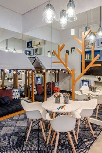 A brinquedoteca conta com uma casinha montessoriana, mesinha com cadeiras, tv e estantes para colocar livros e brinquedos. O mobiliário tem design lúdico, como pode ser observado na cômoda, no berço e na cama. O espaço homenageia Cláudia Mongruel e seus dois filhos.