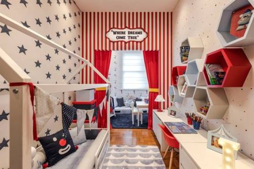 Planejado de forma lúdica e com tons escuros e vivos, o Quarto Picadeiro foi pensado como uma tradução do conceito montessoriano. Com este objetivo, a arquiteta Bruna Souza e a designer Emanuella Leite planejaram um espaço dividido em duas atmosferas para homenagear o pequeno Luiz Fernando Klaime de Souza. No primeiro ambiente estão o armário, a cama Montessori e uma bancada em módulos, todos com altura e dimensões adequadas para o tamanho de uma criança. Um portal com cortinas vermelhas, que remete ao palco de um circo, conduz à área destinada às brincadeiras. Nela, um armário com fantasias e mesinha também foram projetados para destacar o método montessoriano, inspirador do projeto.