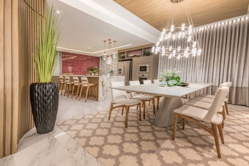 O espaço foi pensado para um casal que tem como hobby cozinhar para os amigos e que é amante do estilo contemporâneo, mas com uma pitada de ousadia. A funcionalidade é a palavra de ordem. Na cozinha, tudo fica ao alcance da mão, assim, os anfitriões podem, ao mesmo tempo, receber e preparar o jantar em ambientes integrados. Destacam-se na proposta: o respeito ao meio ambiente, os materiais nobres, como o mármore, e a tecnologia em automação.