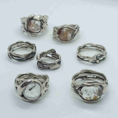 Os materiais escolhidos pelos joalheiros para a elaboração de suas peças impressionam pela diversidade e originalidade. Mesmo os mais conhecidos, como a prata, ganham nas mãos de seus autores formatos inusitados. Aqui estão alguns exemplos de peças e seus autores que estarão entre os participantes do Joiarte.