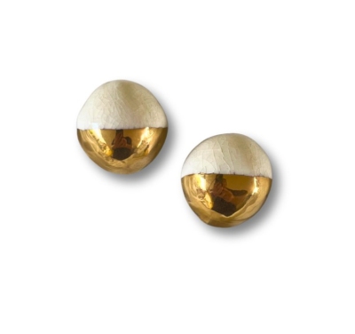 Brincos em cerâmica, dourado e bege, do Barroca Atelier
