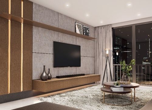 Neste home theater, o padrão Aurum foi aplicado como revestimento, deixando o ambiente mais sofisticado.