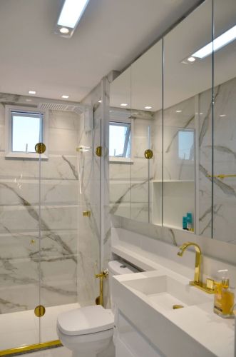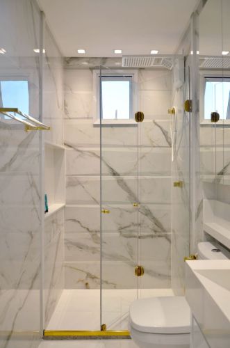 Se o ouro voltou a inspirar a decoração ele não precisa necessariamente invadir a casa toda para proporcionar o clima de boas vibrações que lhe é simbolicamente inerente. O dourado pode dar um toque sofisticado em detalhes preciosos na composição de um espaço. Esta foi a intenção da arquiteta Jessica Nunes, parceira da Ideia Glass, marca especializada em kits de ferragens para box de banho e portas de vidro divisórias de ambiente, para o projeto de um banheiro para casal com a exígua metragem de  2,70m X 1,20m. Tendo o estilo moderno como base, a profissional equilibrou a decoração com o uso de materiais e texturas nobres, como os metais em dourado, revestimento de mármore carrara e a generalizada opção pela cor branca. A sensação de um ambiente mais amplo foi obtida com a utilização de espelhos e a praticidade do box com abertura articulada – ele não possui trilho na parte superior o que dá ao conjunto um visual mais clean e moderno.