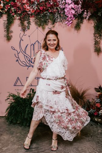 Vincenza Bonaccorsi tem 53 anos e é uma expert em Artha. Por isso, tem uma razão muito especial para se sentir “orgulhosa” em ser modelo da marca. Ela lembra, com carinho, que conhece Mariana desde a adolescência, seguiu a sua trajetória, a faculdade, os estágios e até quando ela dançava no grupo de Street Dance. As suas idas à Sampa e o início da Artha na Matheus Leme com o bar. Entregou-se, assim, de olhos fechados para a criação de sua noiva com a segurança de quem convive, desde os primeiros passos, com a história da grife e de sua idealizadora. A sua vivência, contudo, foi que inspirou o seu vestido. Vincenza gosta da natureza e busca no cotidiano, através dos detalhes, os pequenos milagres, como uma brisa, um perfume perdido no ar, os reflexos do orvalho, as gotas de chuva, que com a luz criam o arco-íris, ou a tempestade que se aproxima.Uma intimidade tão grande com a natureza que a levou a morar em uma chácara. Casou, teve uma filha, que foi criada livremente, perto de árvores e animais. Ama a sua profissão, que lida com o ser humano, e a conduz por um caminho de descobertas maravilhosas – um universo em cada detalhe, olhar, vírgula, sonho, reticência – que transformam o seu dia a dia em algo especial, divino e único.